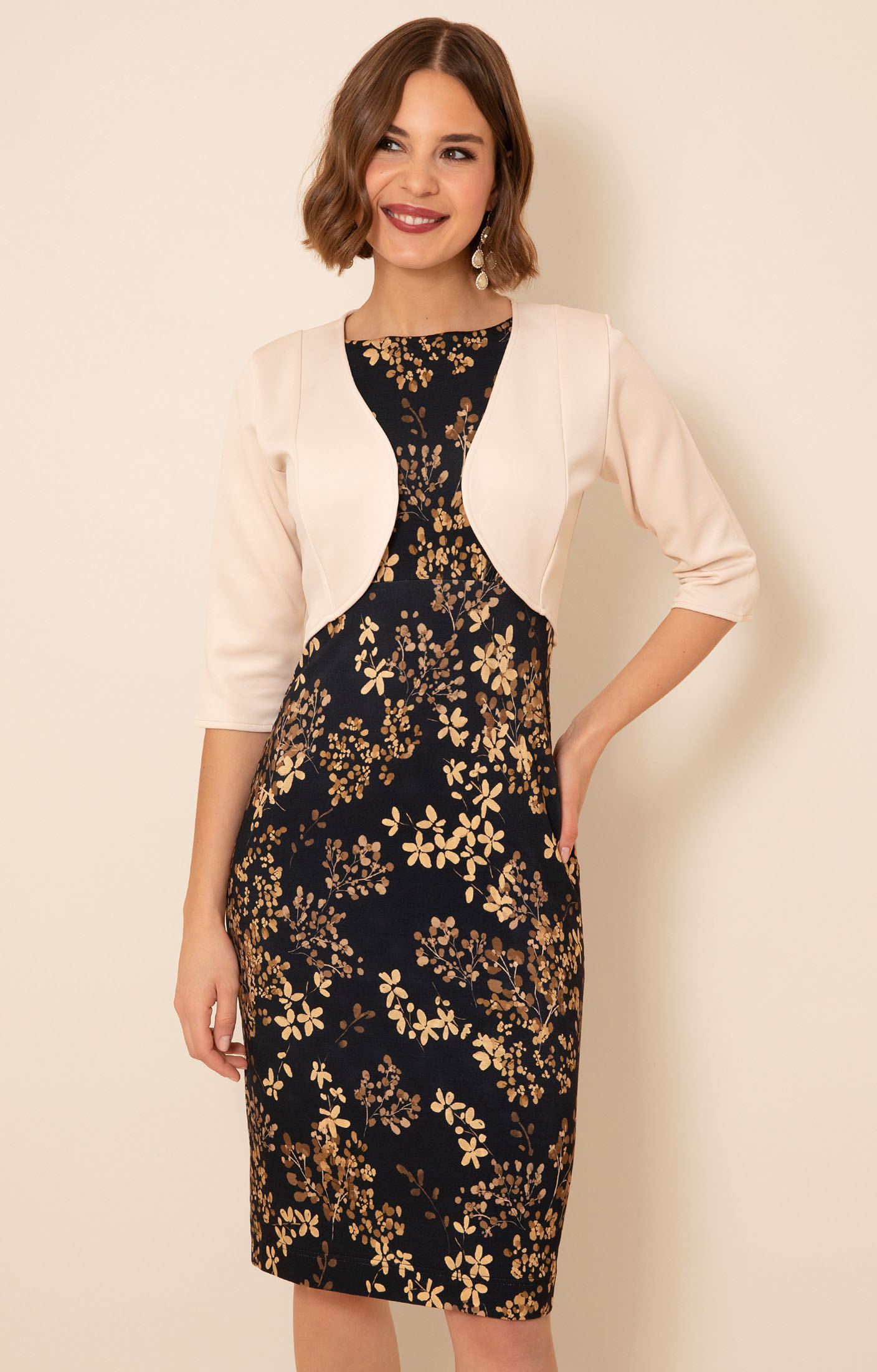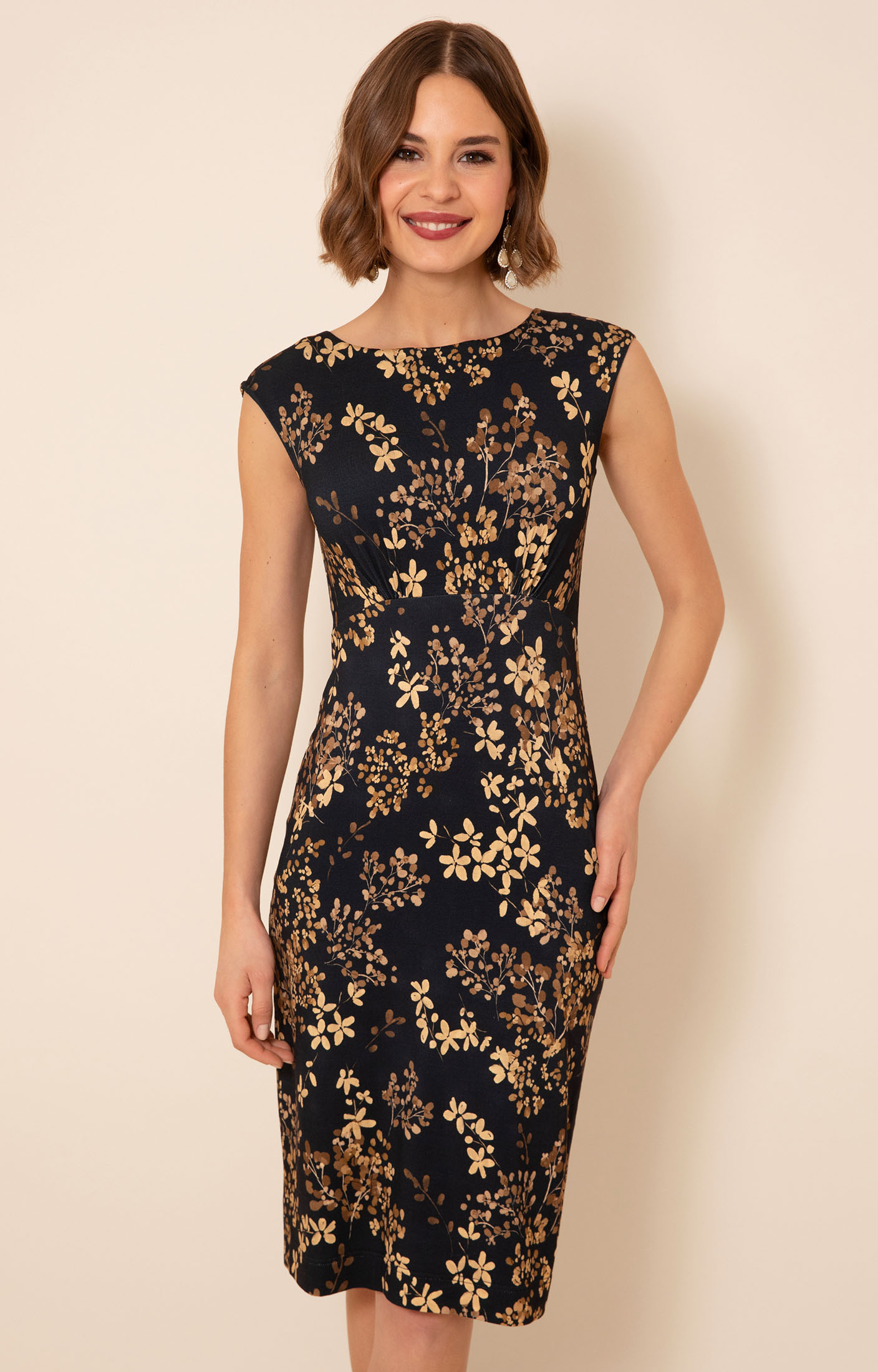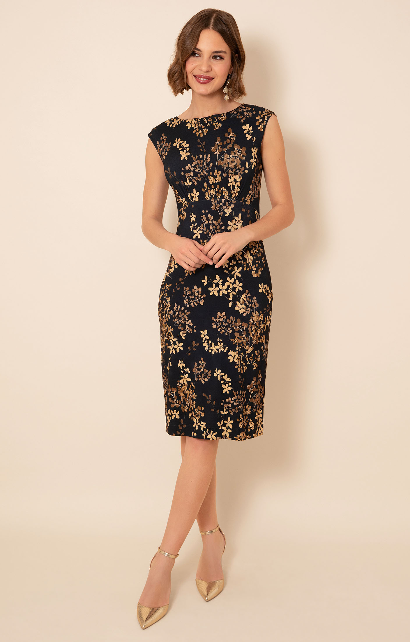 Refined, feminine and infinitely chic, our new Pippa Shift Dress in Golden Blossom is made to stand out. Crafted from a gold floral jacquard print over a rich navy black ground, this occasion-ready style exudes a touch of luxury.