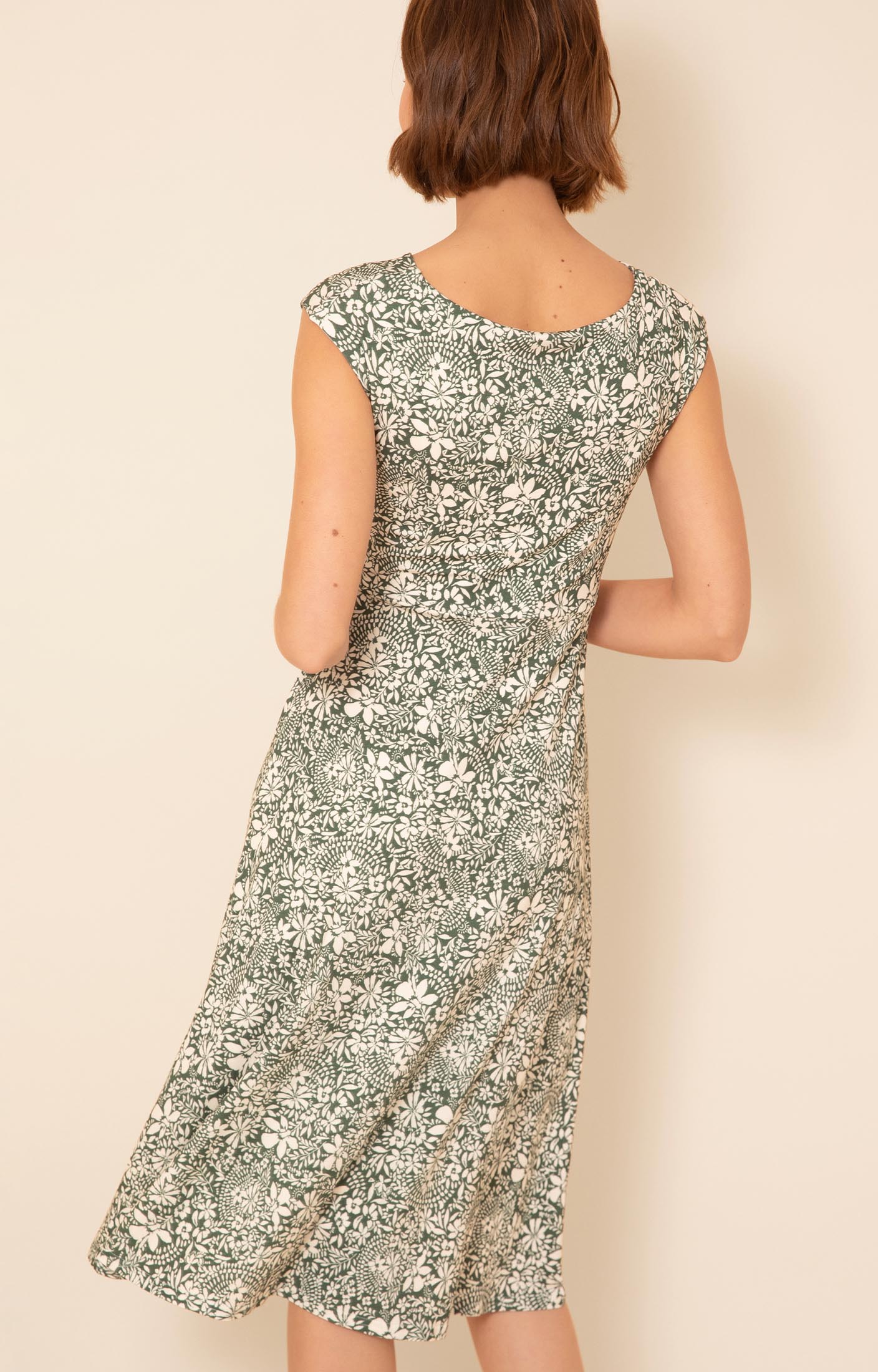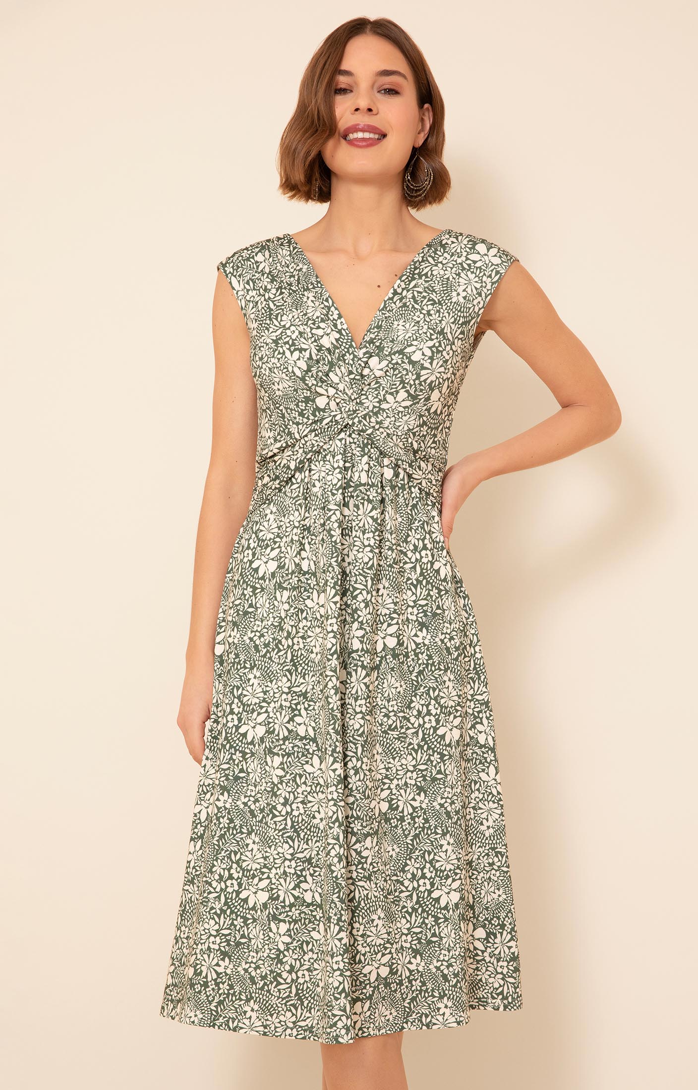 Our stylish and chic Renee Knot Dress in Botanical Green is designed to fit and flatter. Crafted from a softly draping stretch jersey, the intricate botanical print pairs soft ivory florals with a rich green ground, creating a look that feels both classic and contemporary.