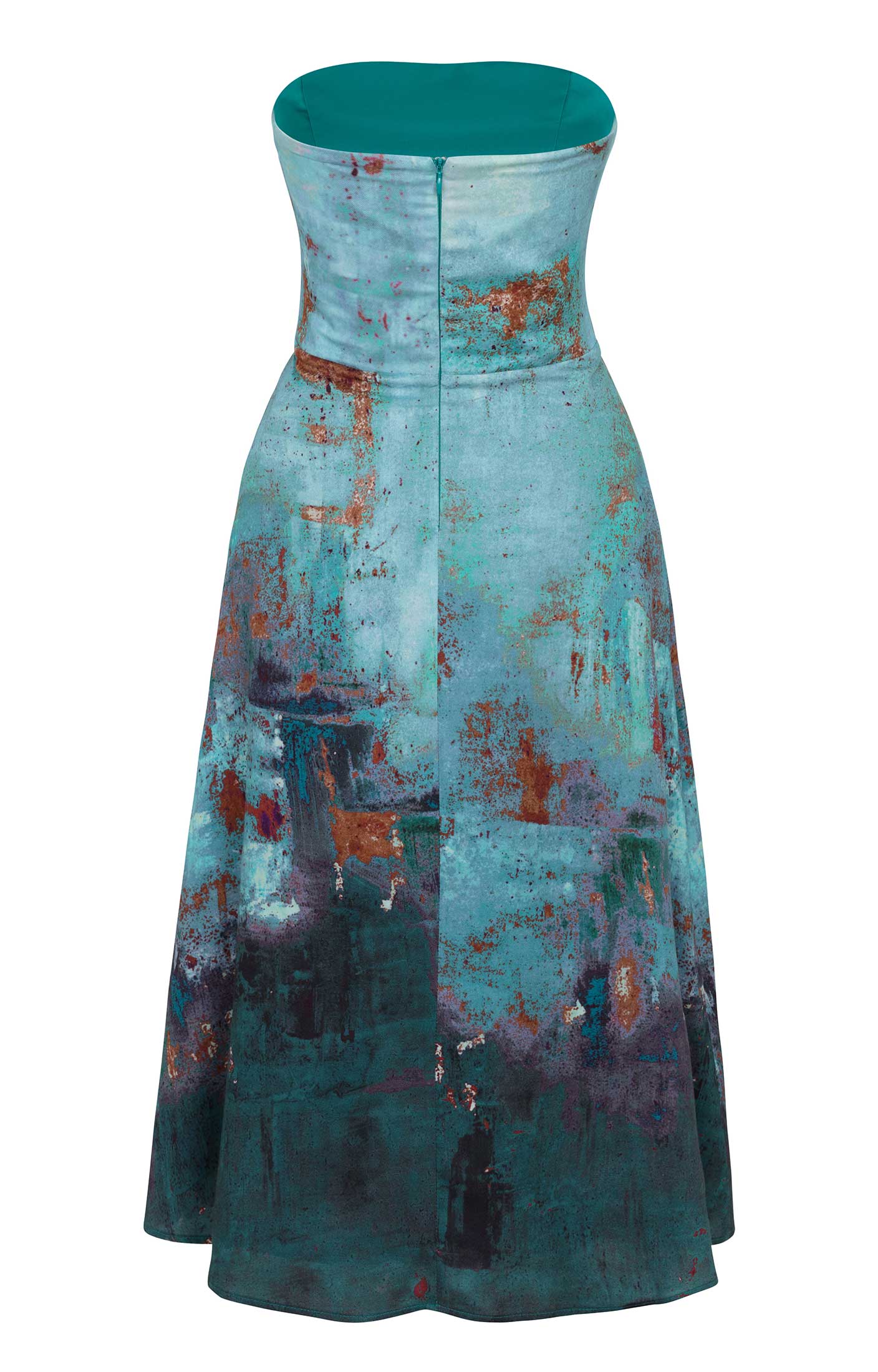 Gentle shades of aqua and turquoise with copper highlights cascade through this painterly print giving a magical, ethereal quality to our pretty party dress.