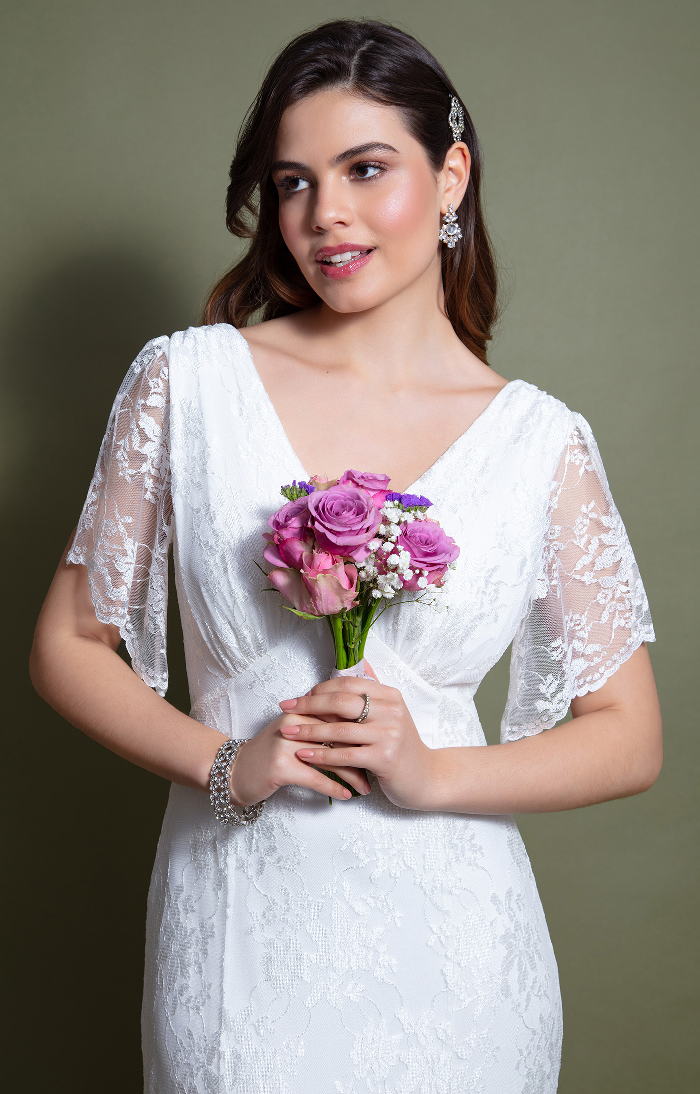 Add a touch of glamour and a hint of drama to your wedding day look. Introducing the Evelyn Lace Bridal Gown. Shaped to sculpt and flow, this vision of lace is cut beautifully to enhance your natural curves. Designed with a plunging V neckline, shaped empire waist and split sleeves.