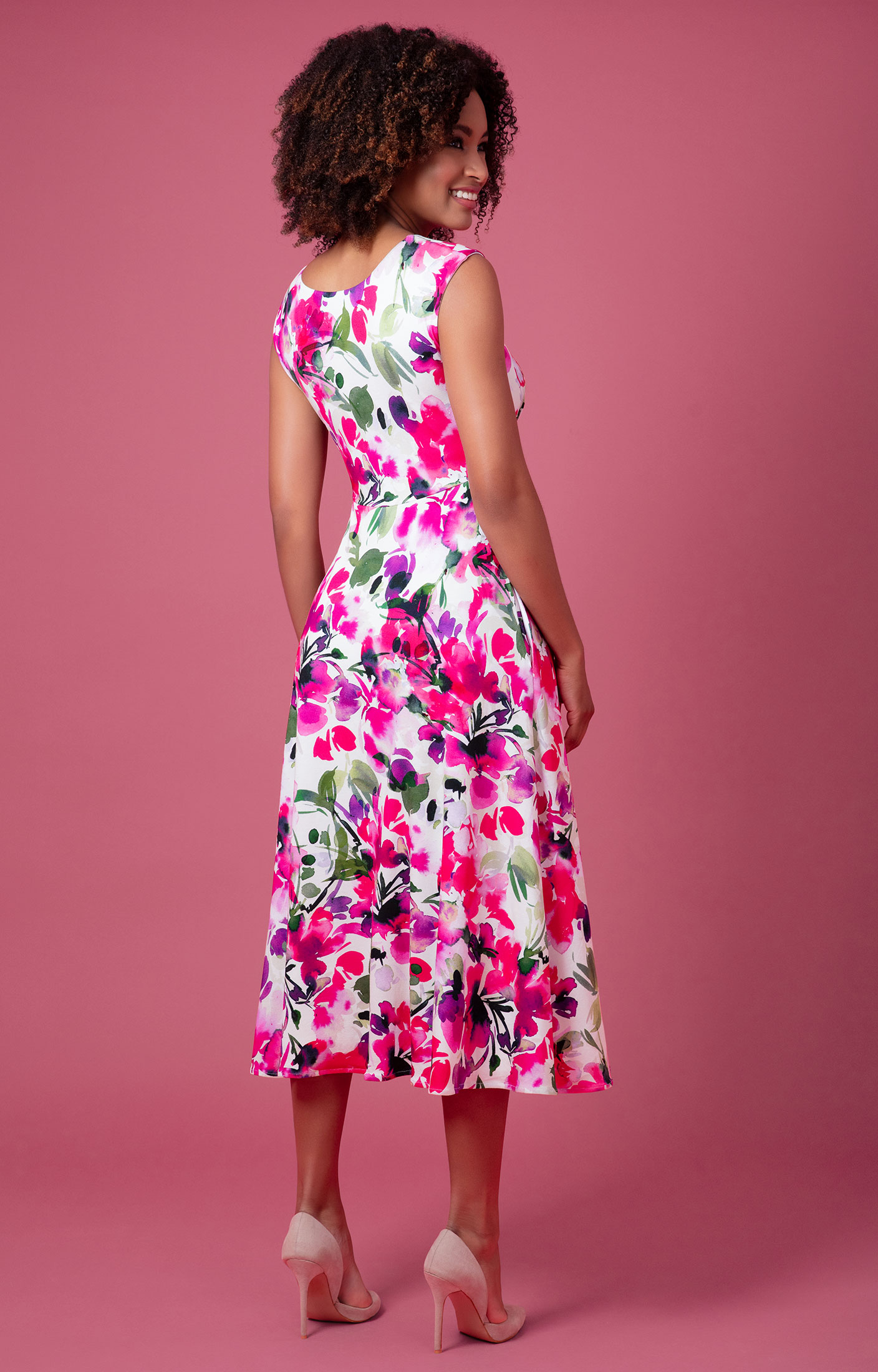 Dominated by rich shades of fuchsia; our new Luna Midi dress features a lively floral pattern that captures the essence of spring and summer gardens in full bloom.