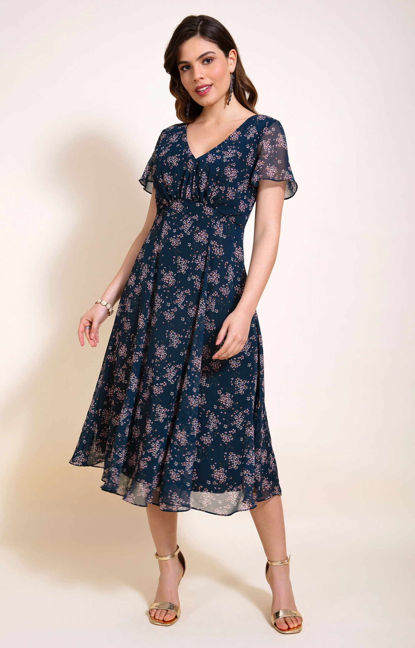 • Flowing midi dress in navy, dusky pink and cream floral print
