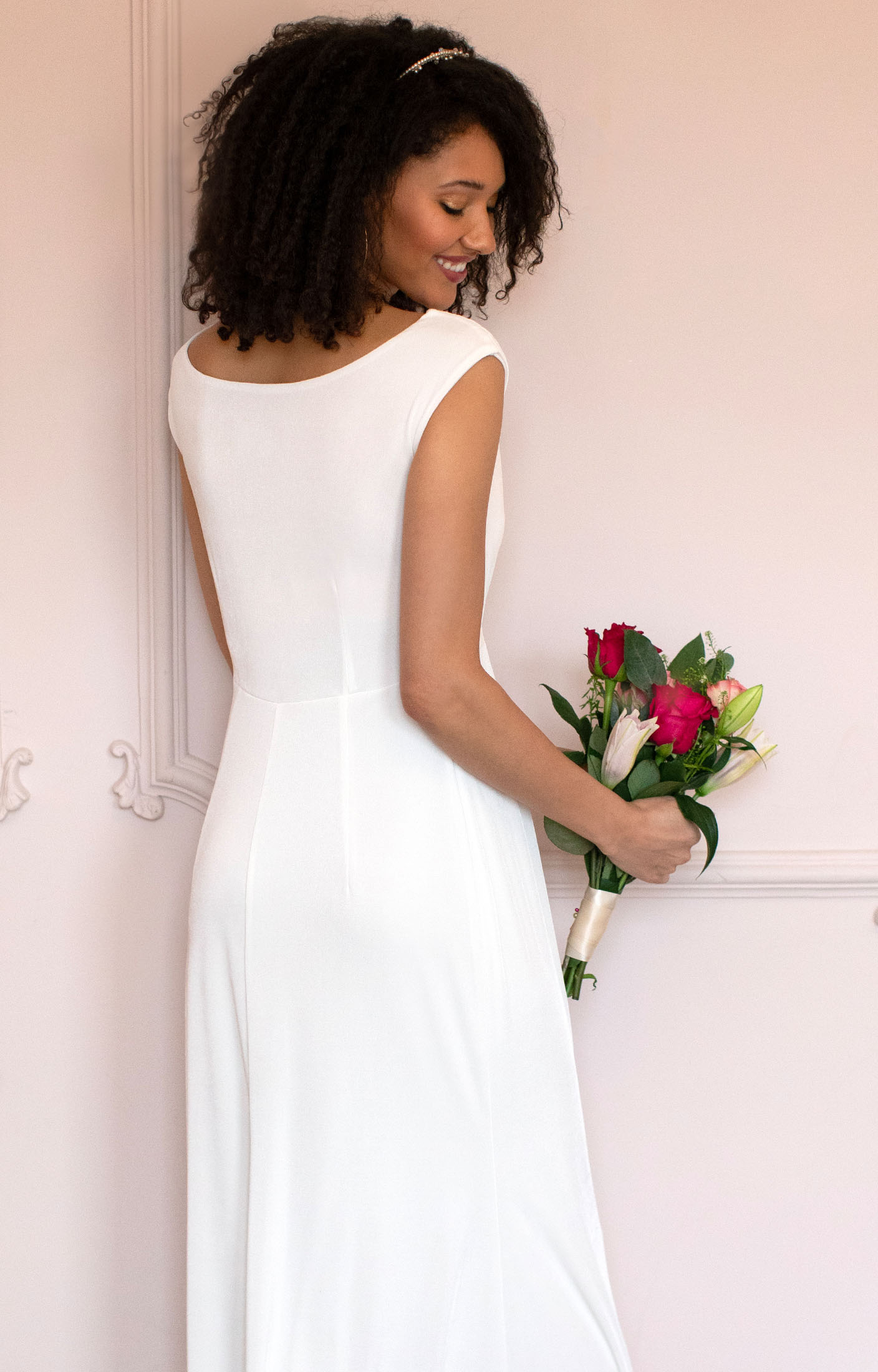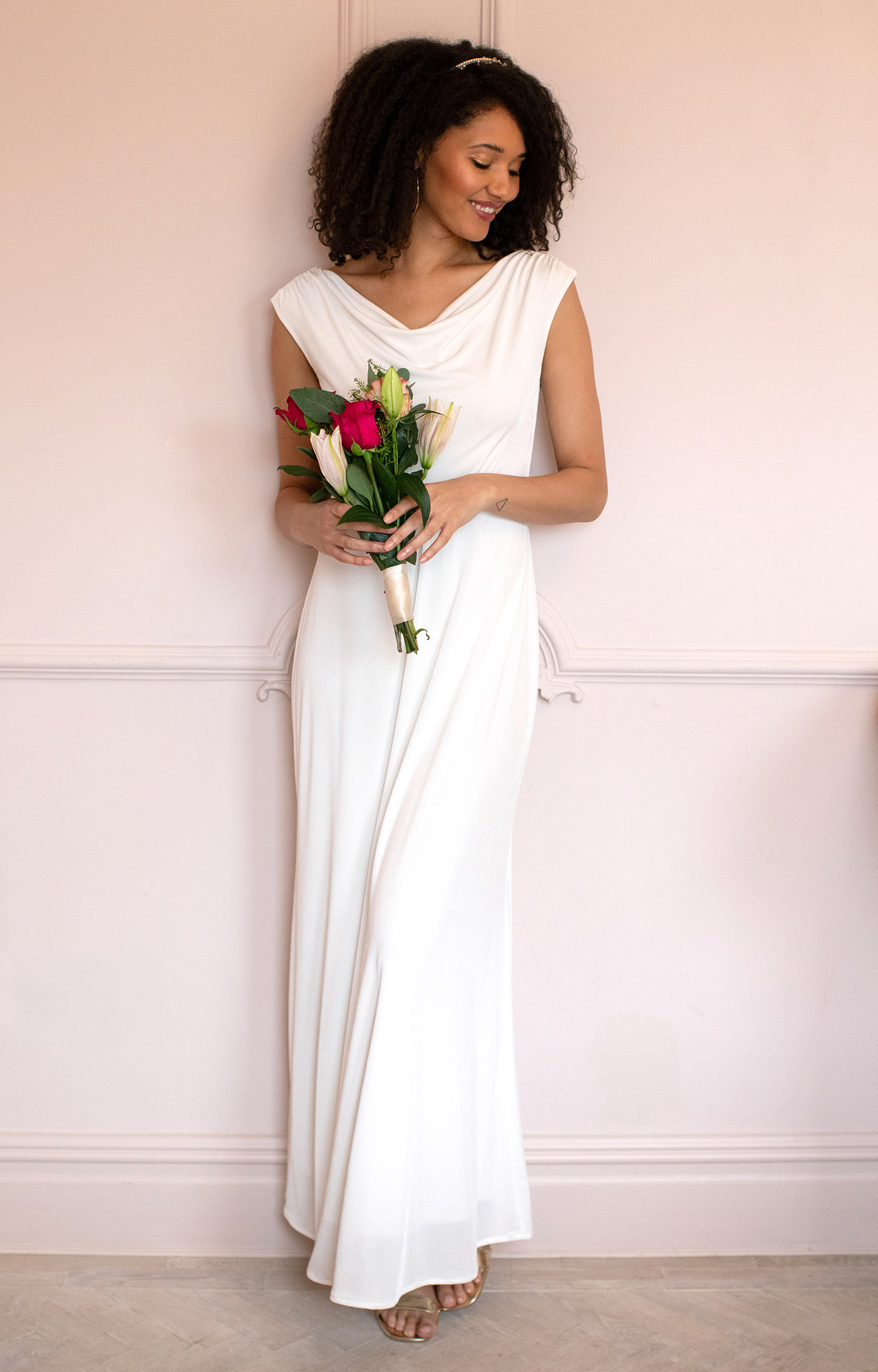 Perfect for the modern bride seeking vintage glamour. Our Cruise Maxi Dress in luxurious ivory is a softly tailored gown with subtle drape and sheen. A cowl neckline adds grown-up drama whilst the full flowing skirt and flattering shoulder coverage creates timeless elegance.