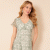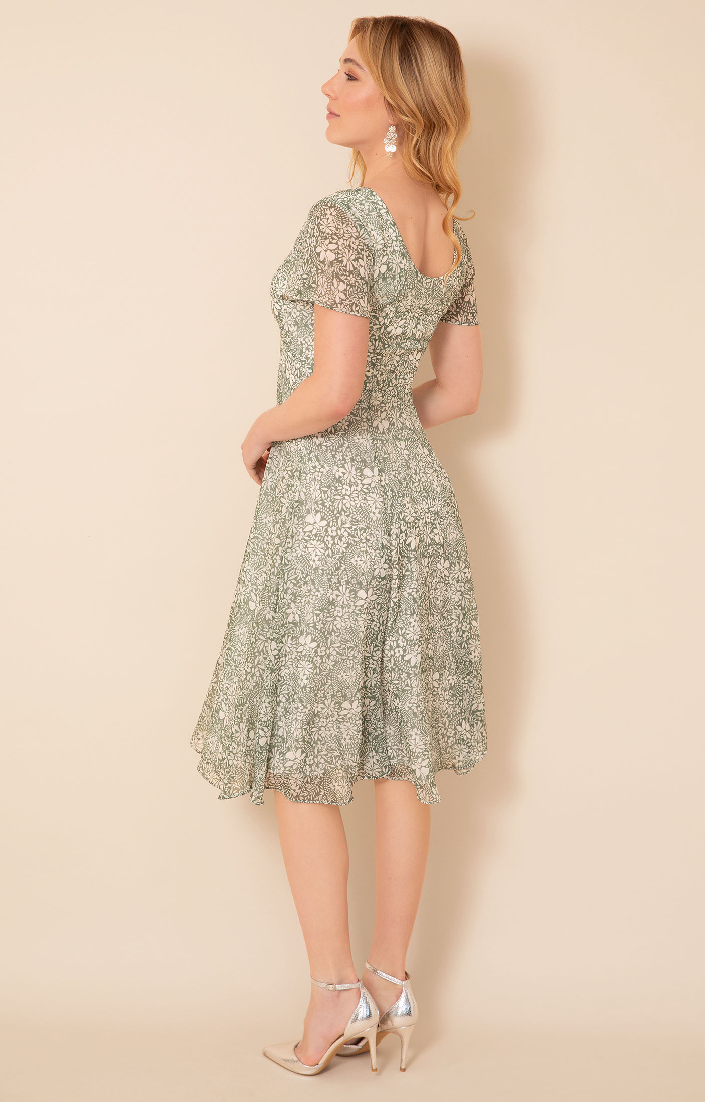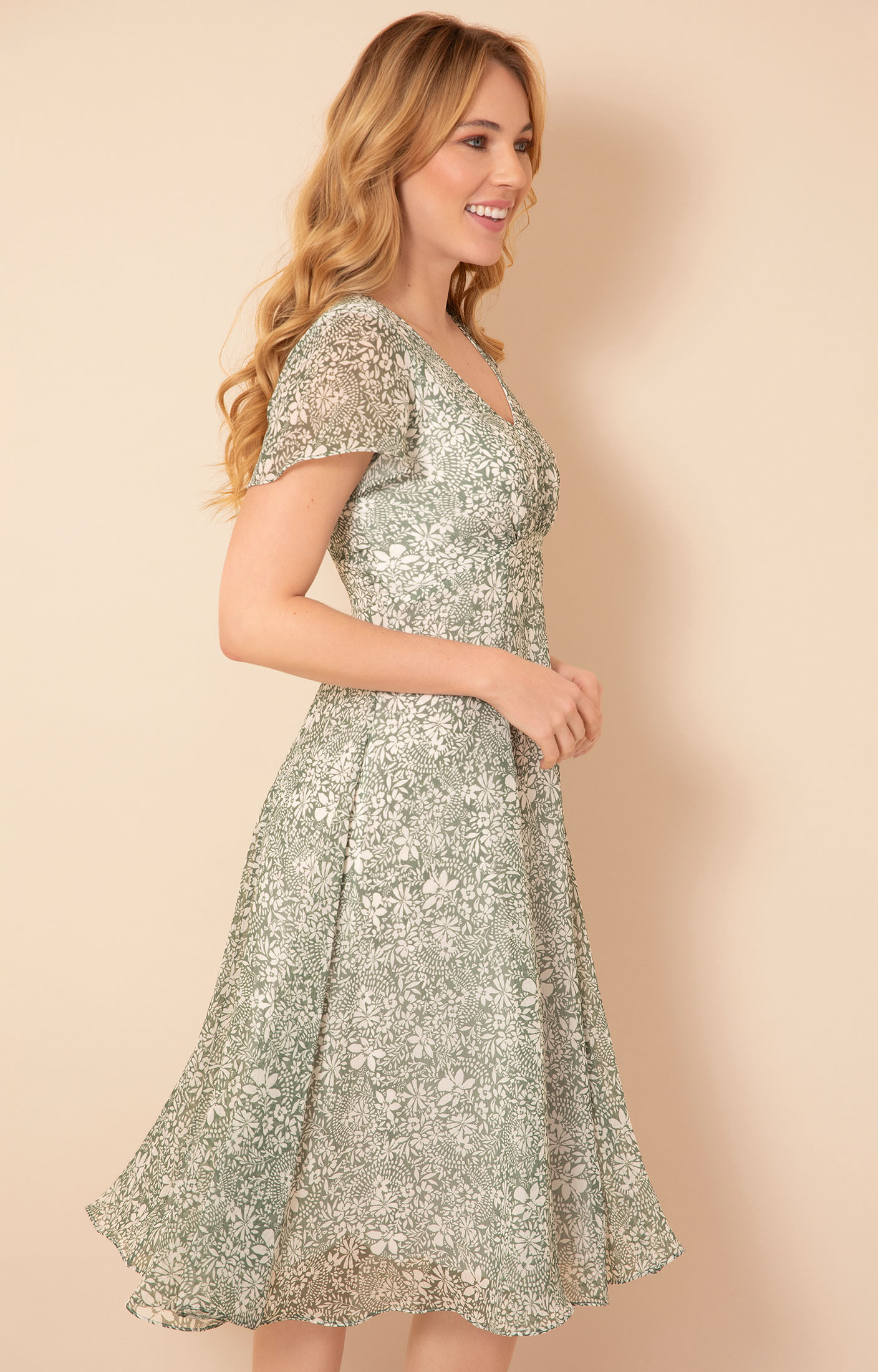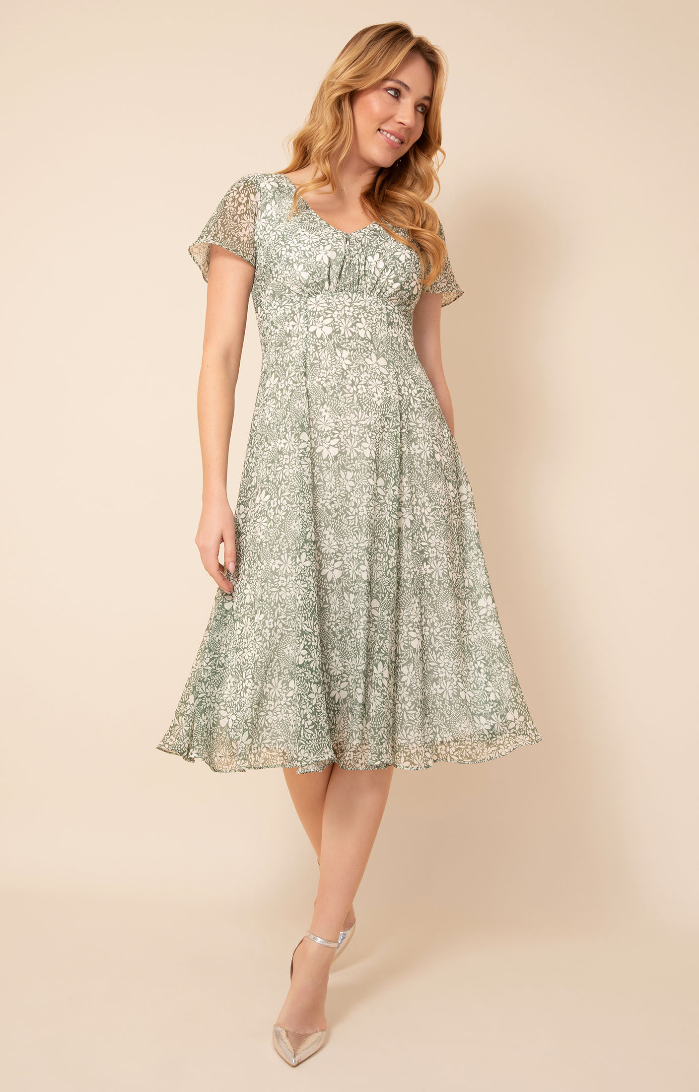 Light, floaty chiffon is printed with an intricate botanical pattern in soft green and ivory tones, creating a look that feels fresh yet refined. A gently shaped V-neckline is enhanced by delicate gathers through the bodice, drawing into a flattering waistline before falling into a beautifully flowing skirt that moves with ease.