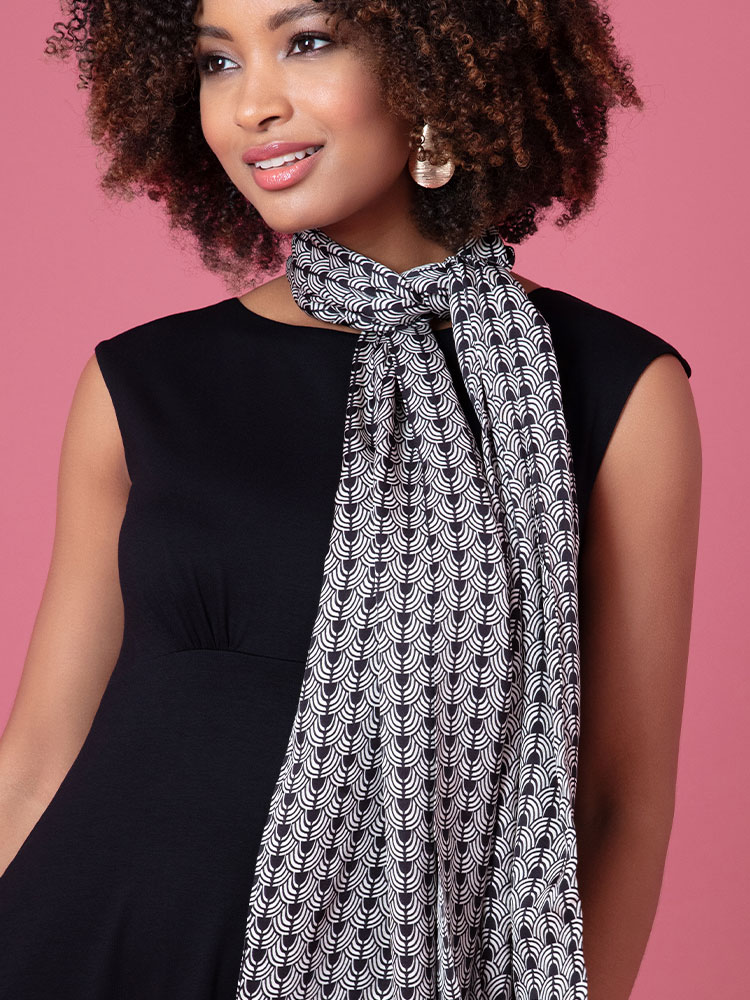 The Phoebe Satin Scarf is a masterpiece of art deco design in classic black and white. Its bold geometric patterns and luxurious satin fabric embody the sophistication of the roaring twenties, making it an ideal gift for those with an appreciation for vintage glamour and modern style.