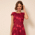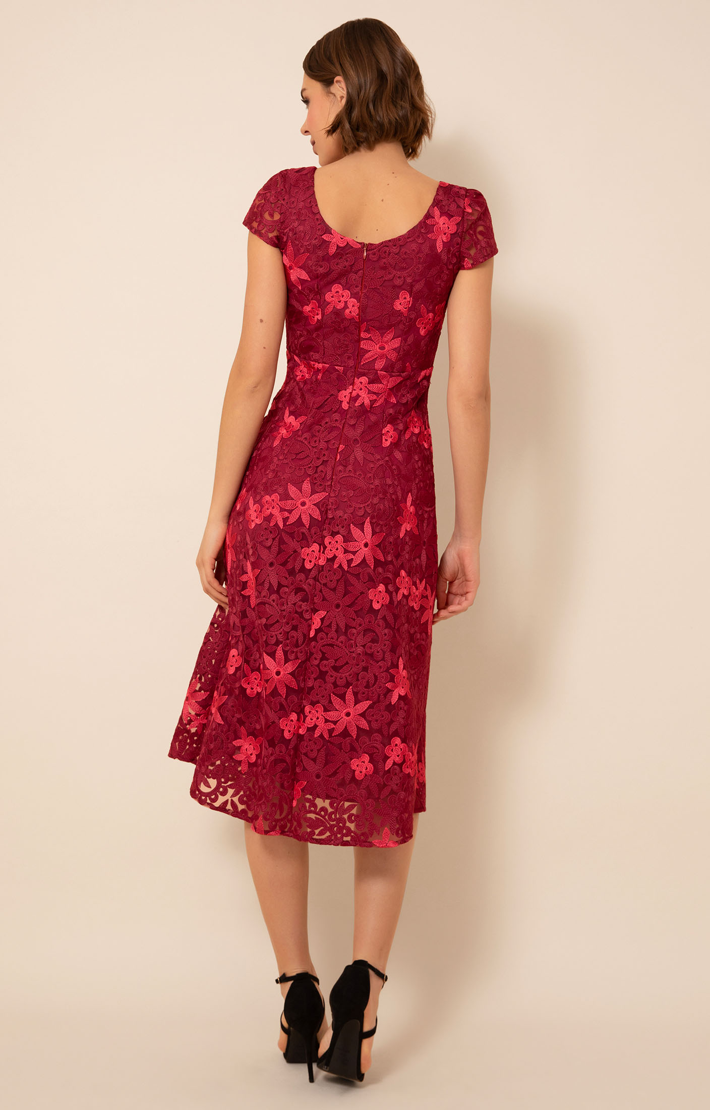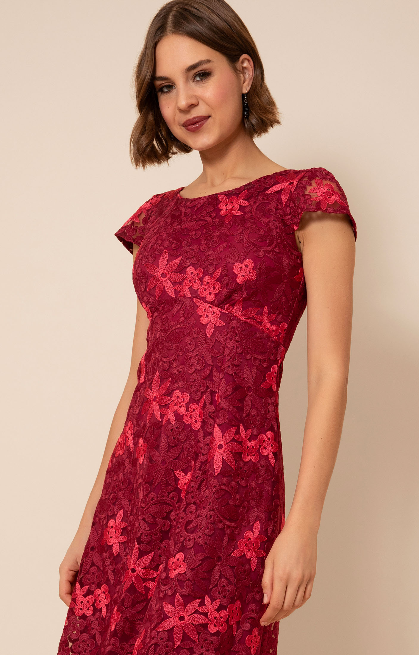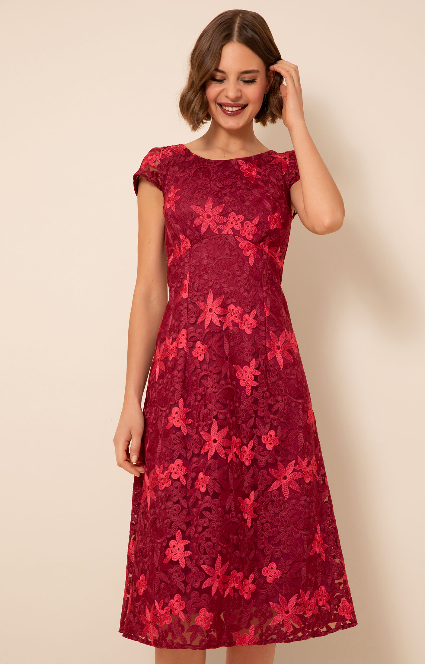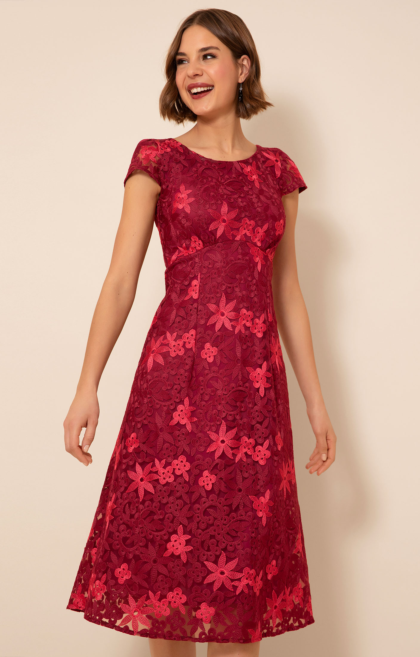 • Embroidered floral lace dress in Azalea Red