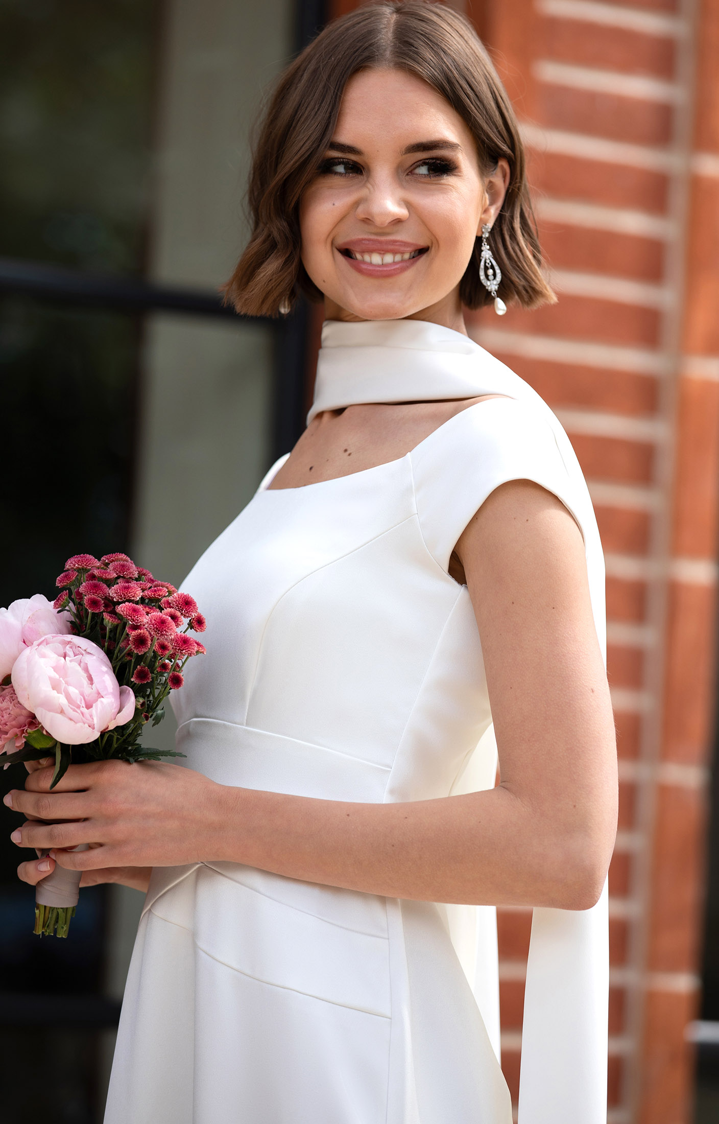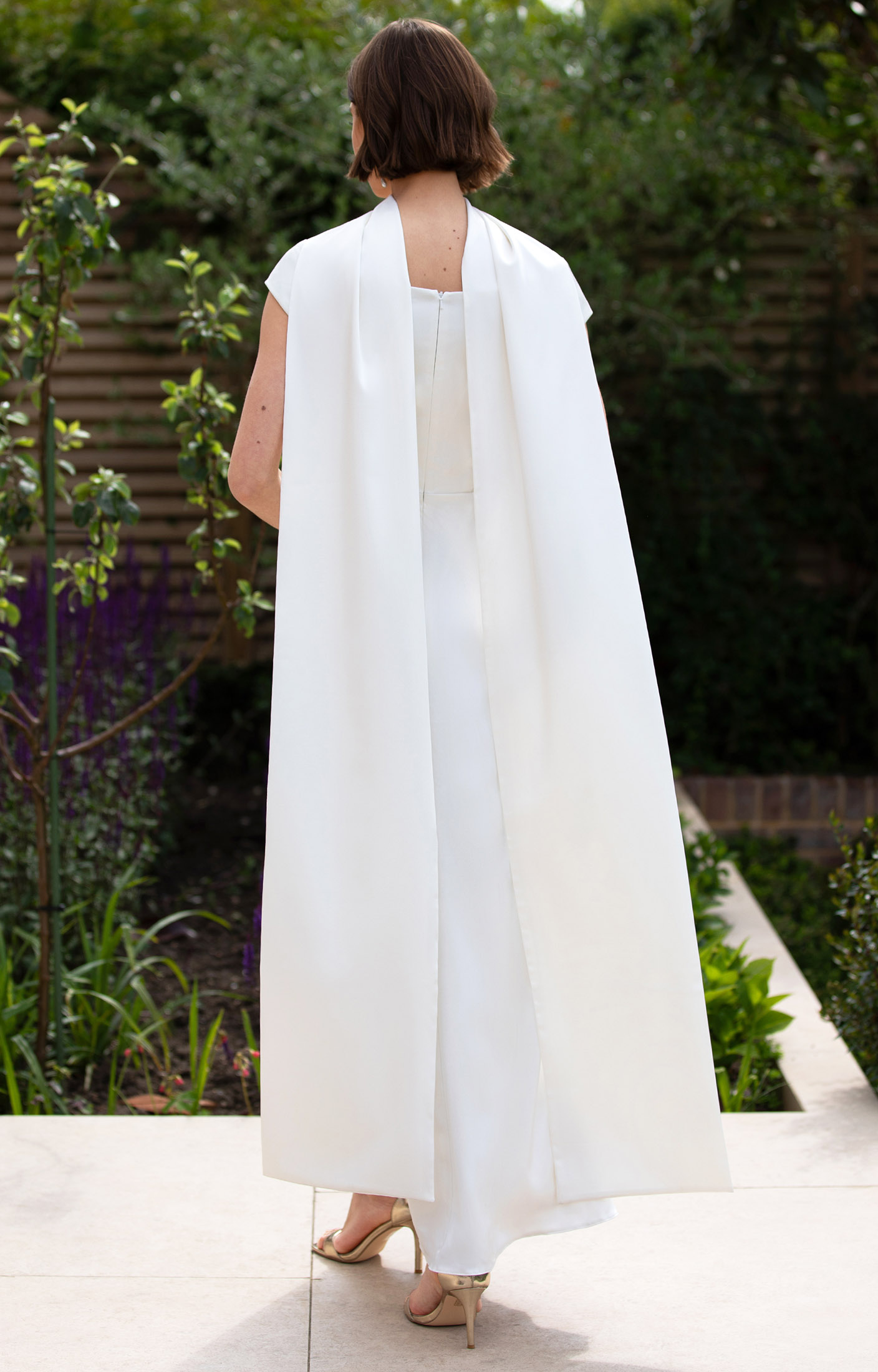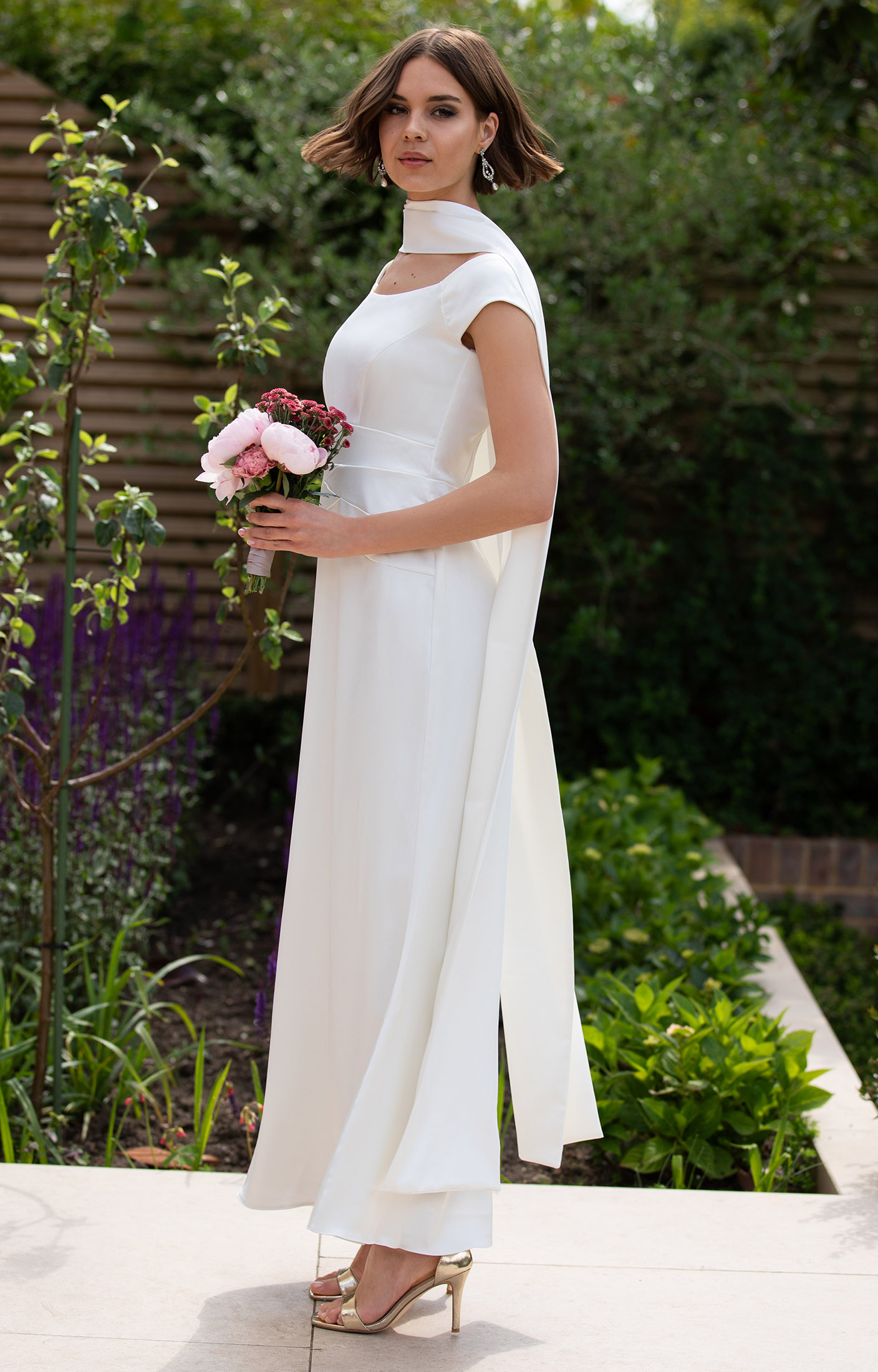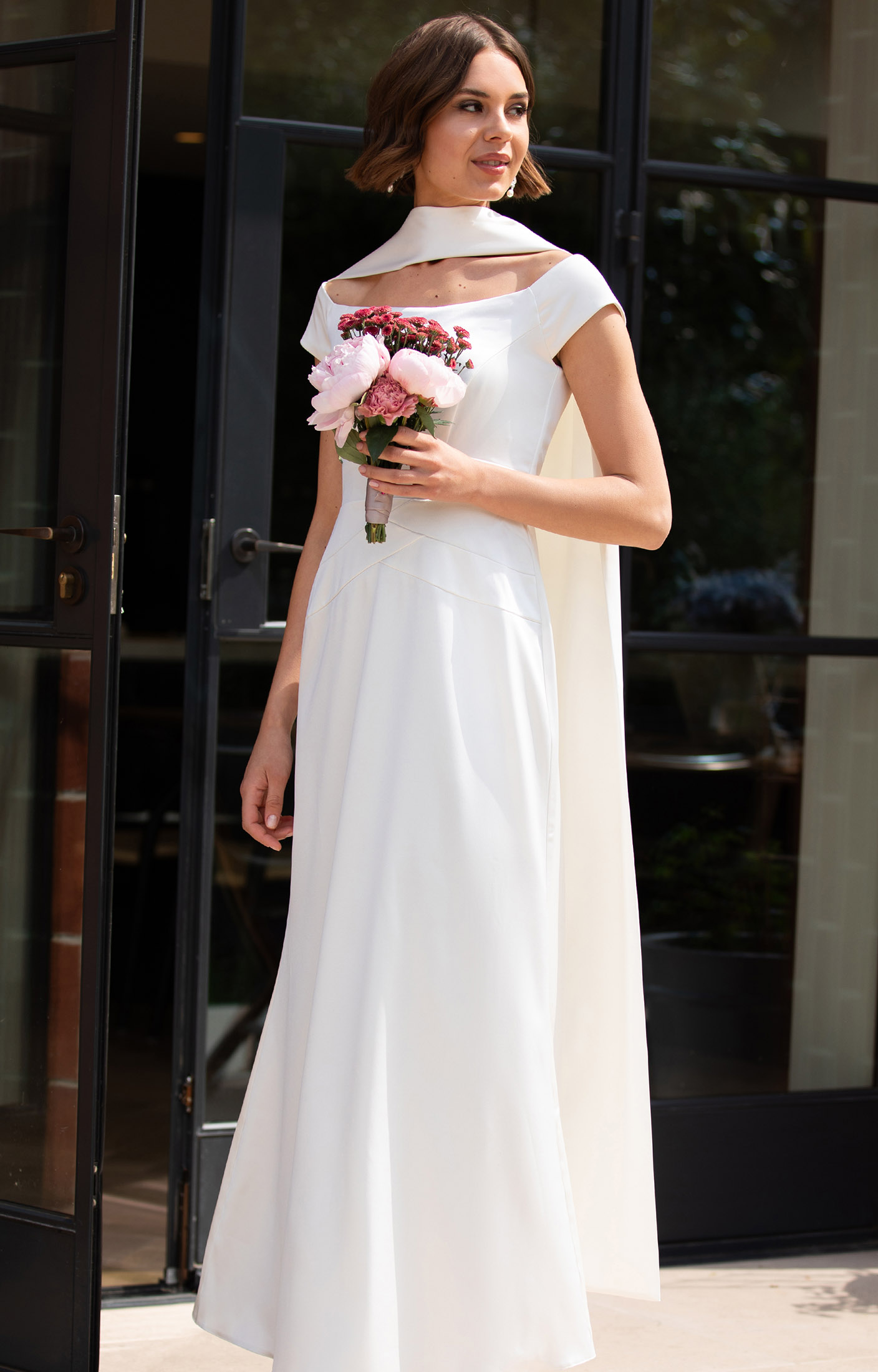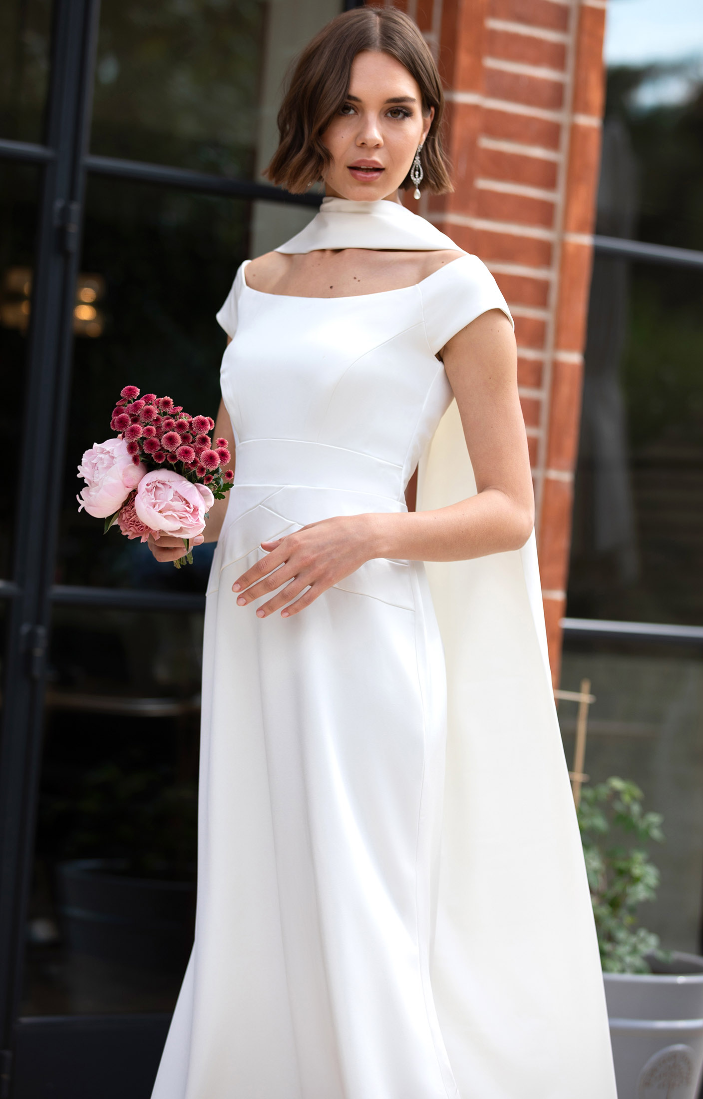 Designed in luxuriously smooth duchesse satin, this elegant accessory offers a structured, elongated drape that adds drama without overwhelming your look. Whether worn softly around the shoulders or styled as a contemporary wrap, it brings a touch of Hollywood glamour to your special day.