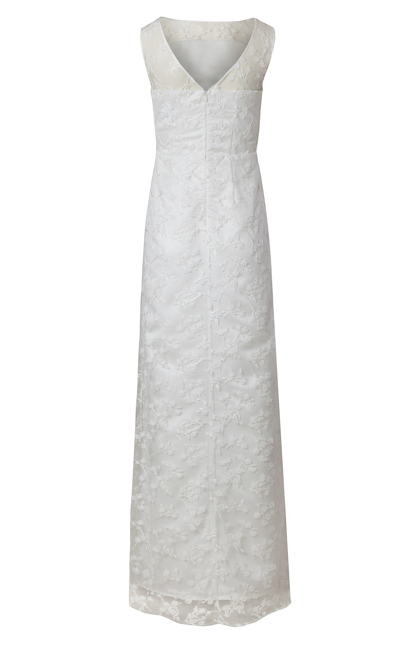Details to love – demure sheer panel, full length gown, sophisticatedly sexy low V back.