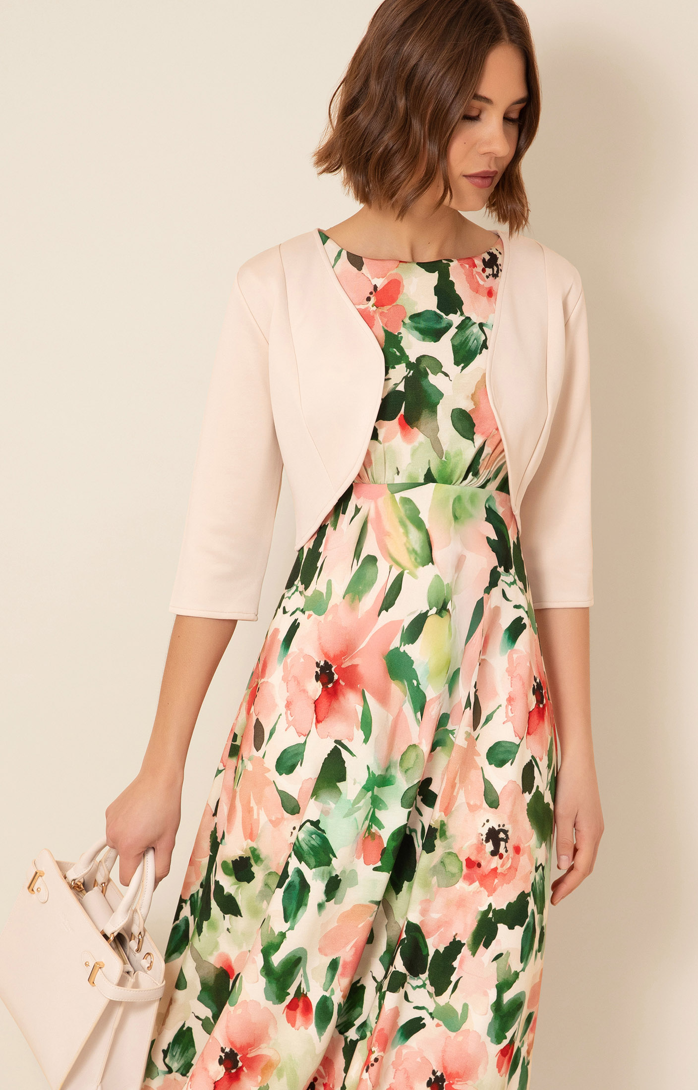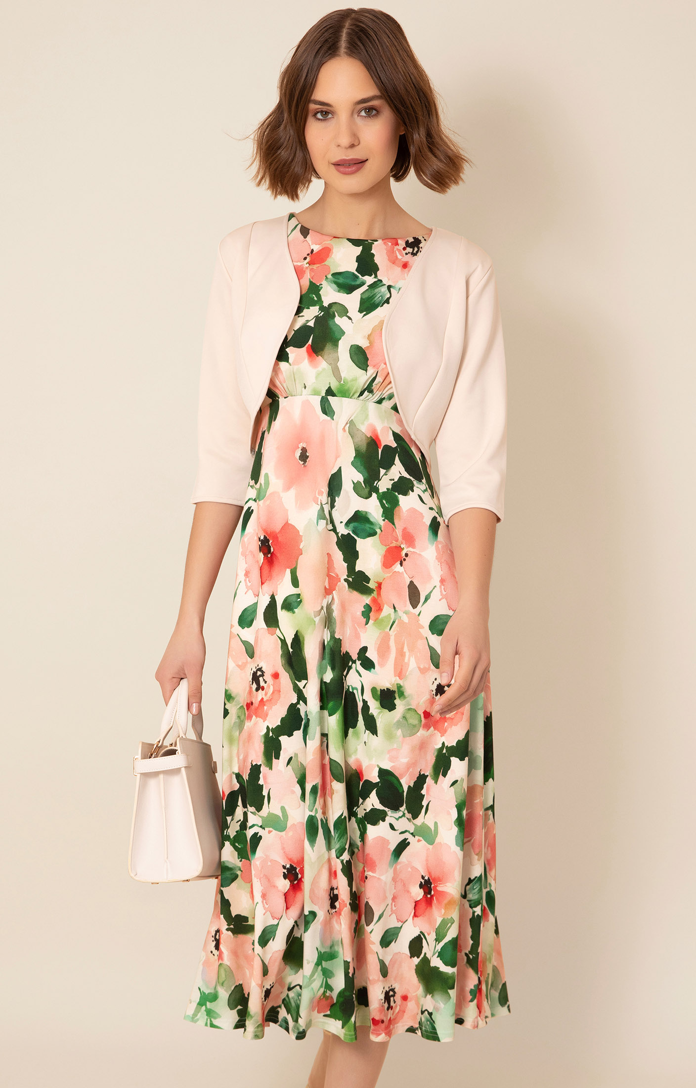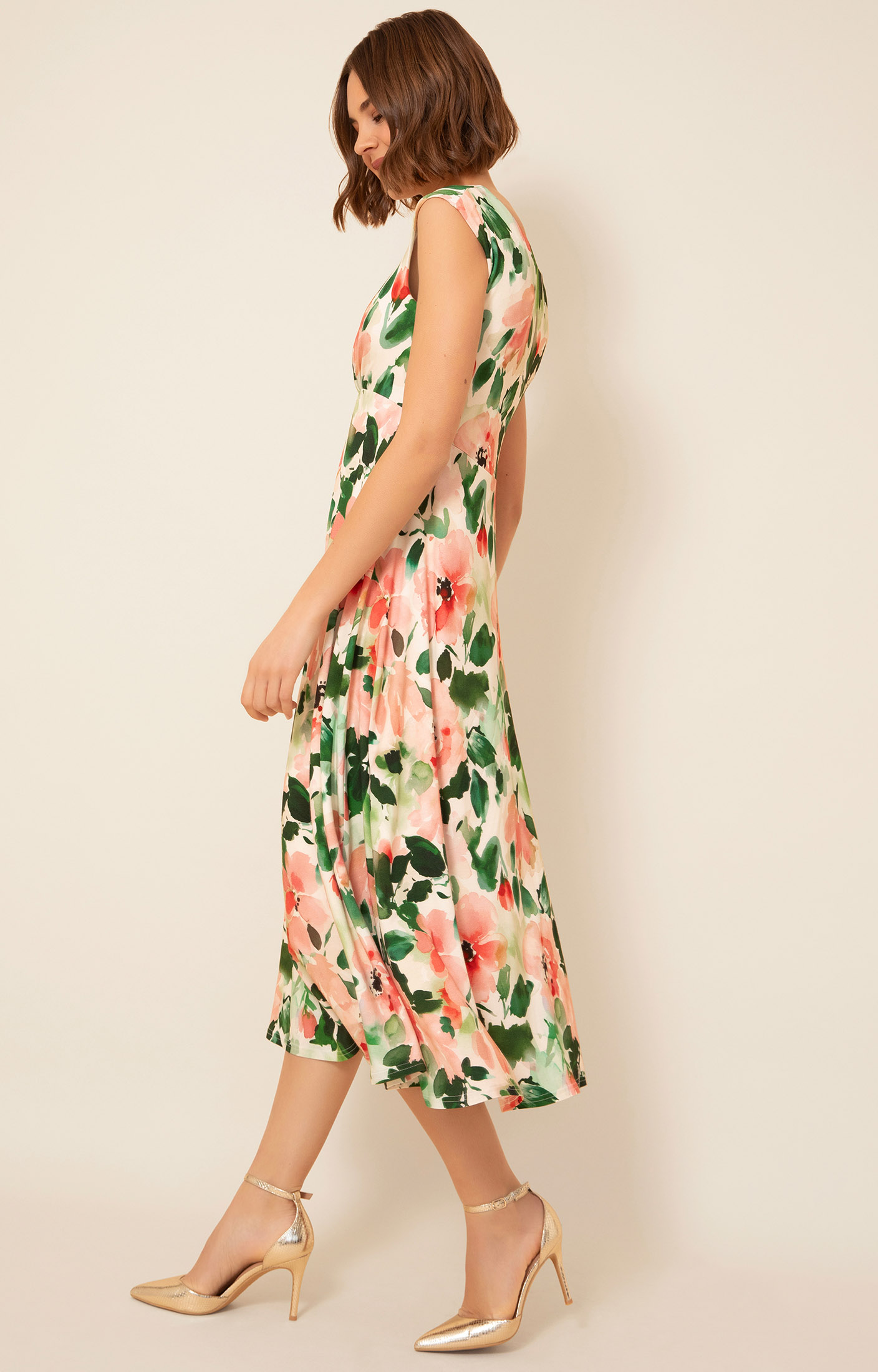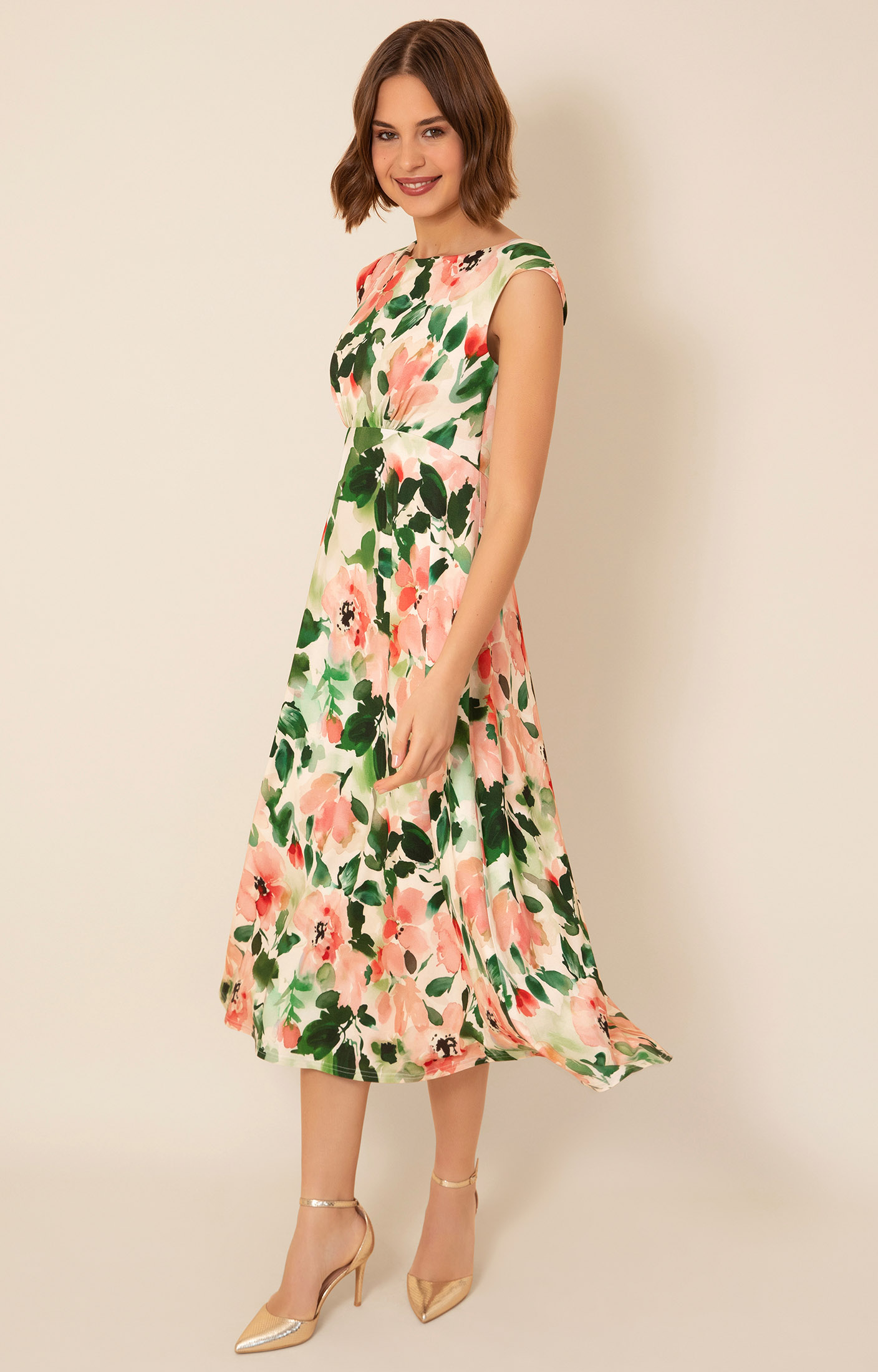 The Luna Midi Dress in Peony Pink is designed for modern occasion dressing. Crafted from smooth, premium jersey, this painterly floral design blends warm peony tones with fresh green leaves on a light, creamy base.