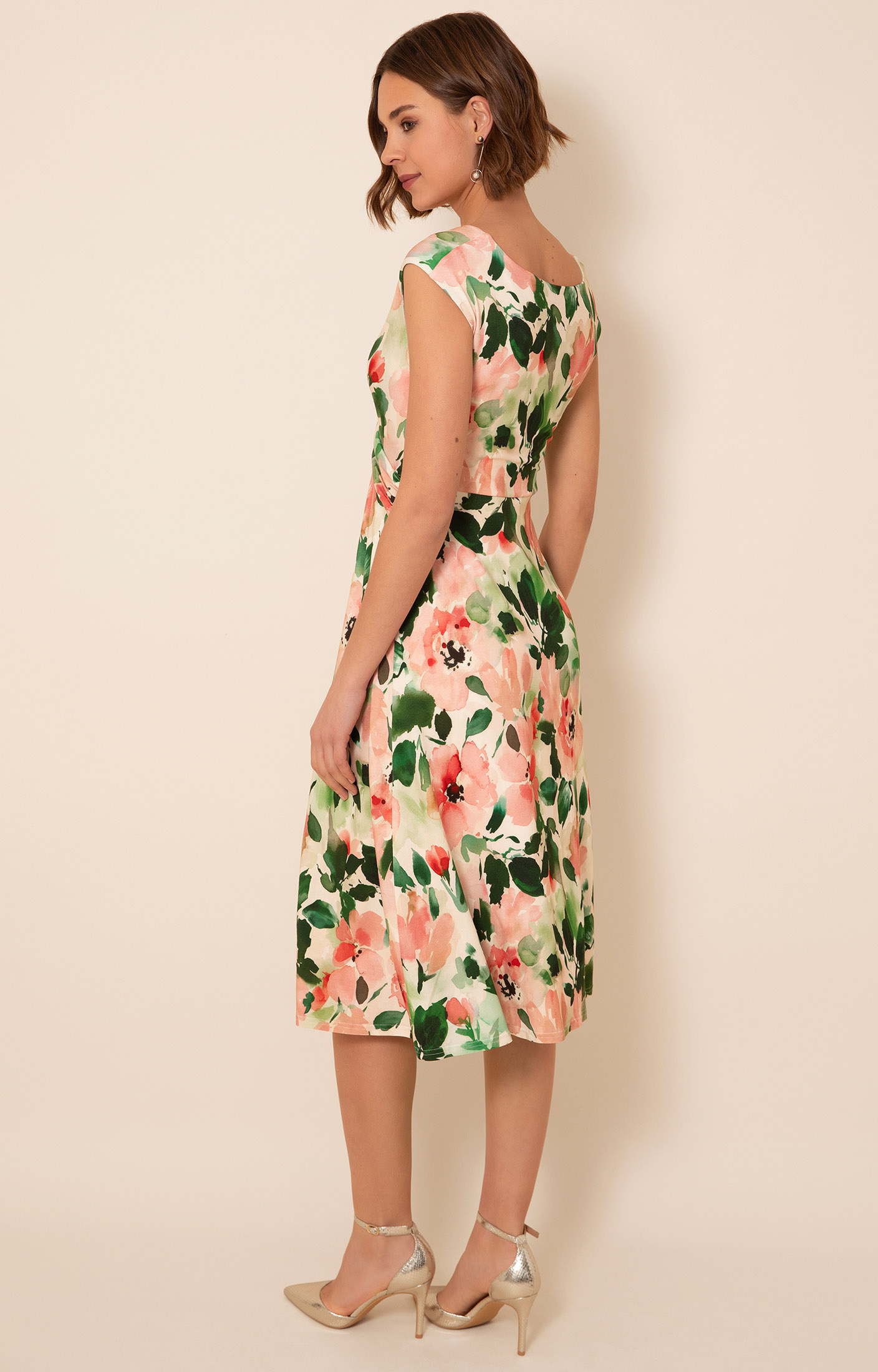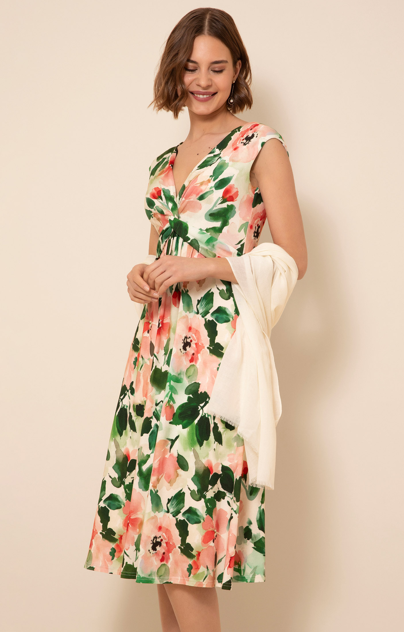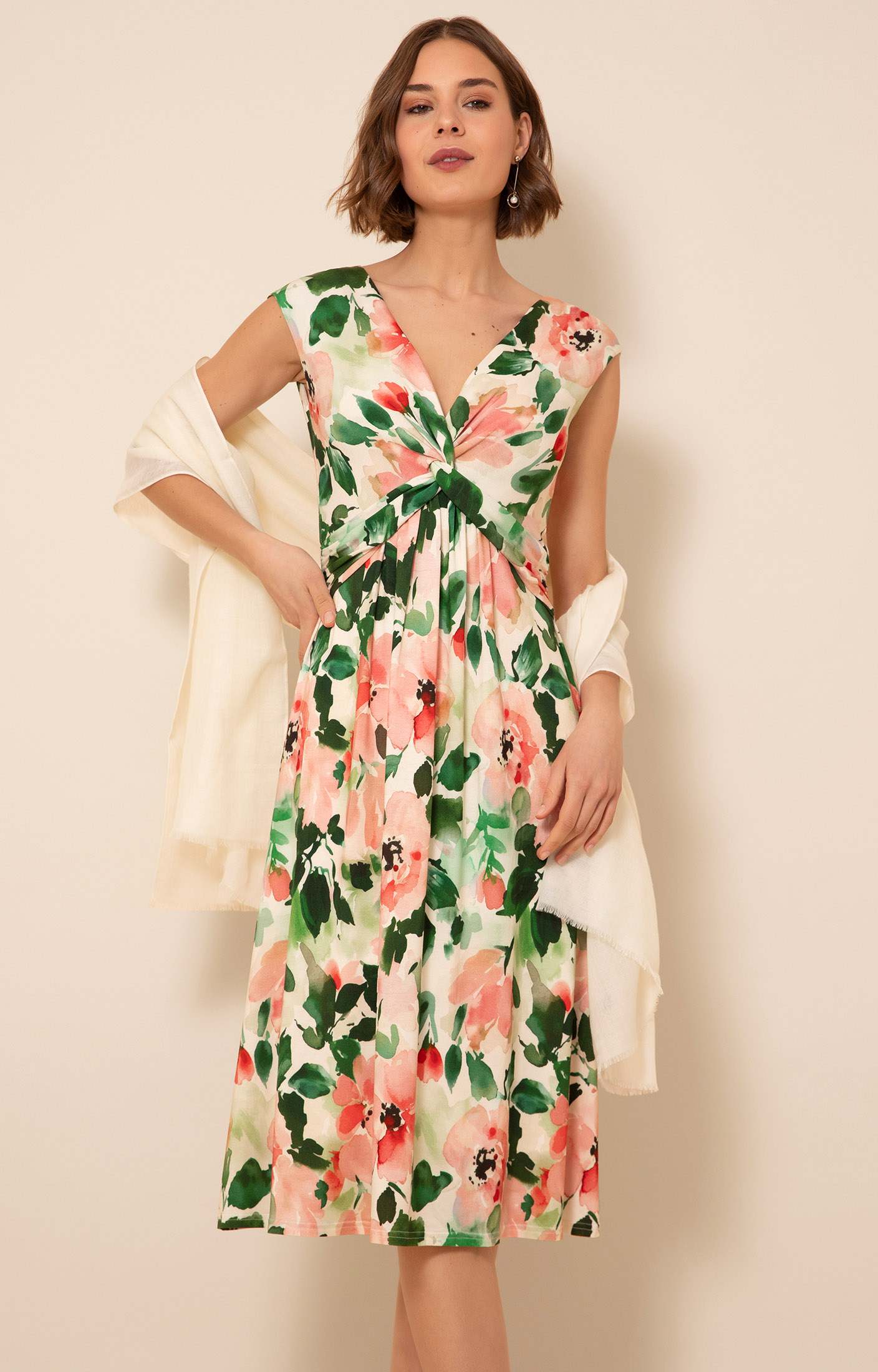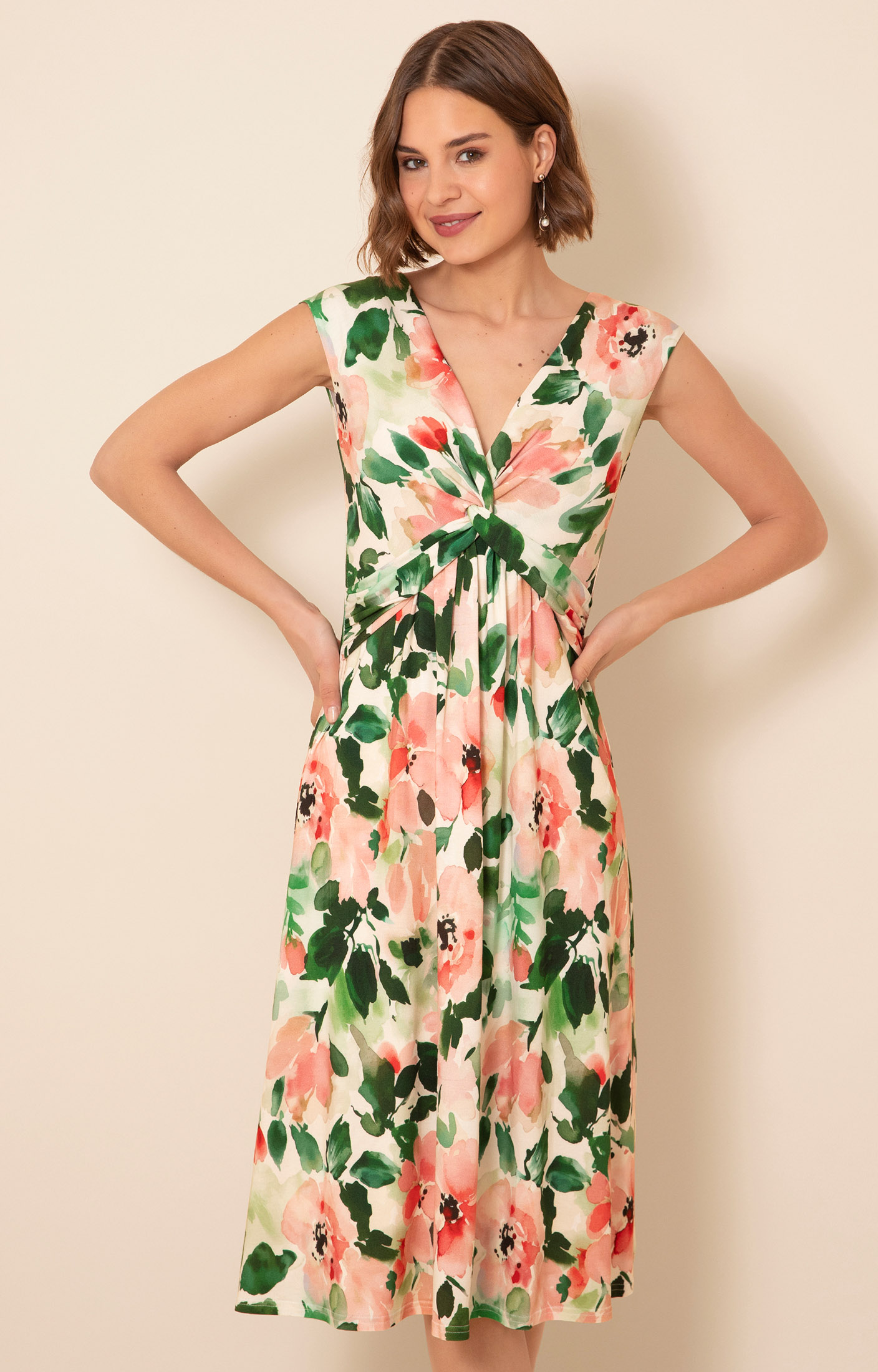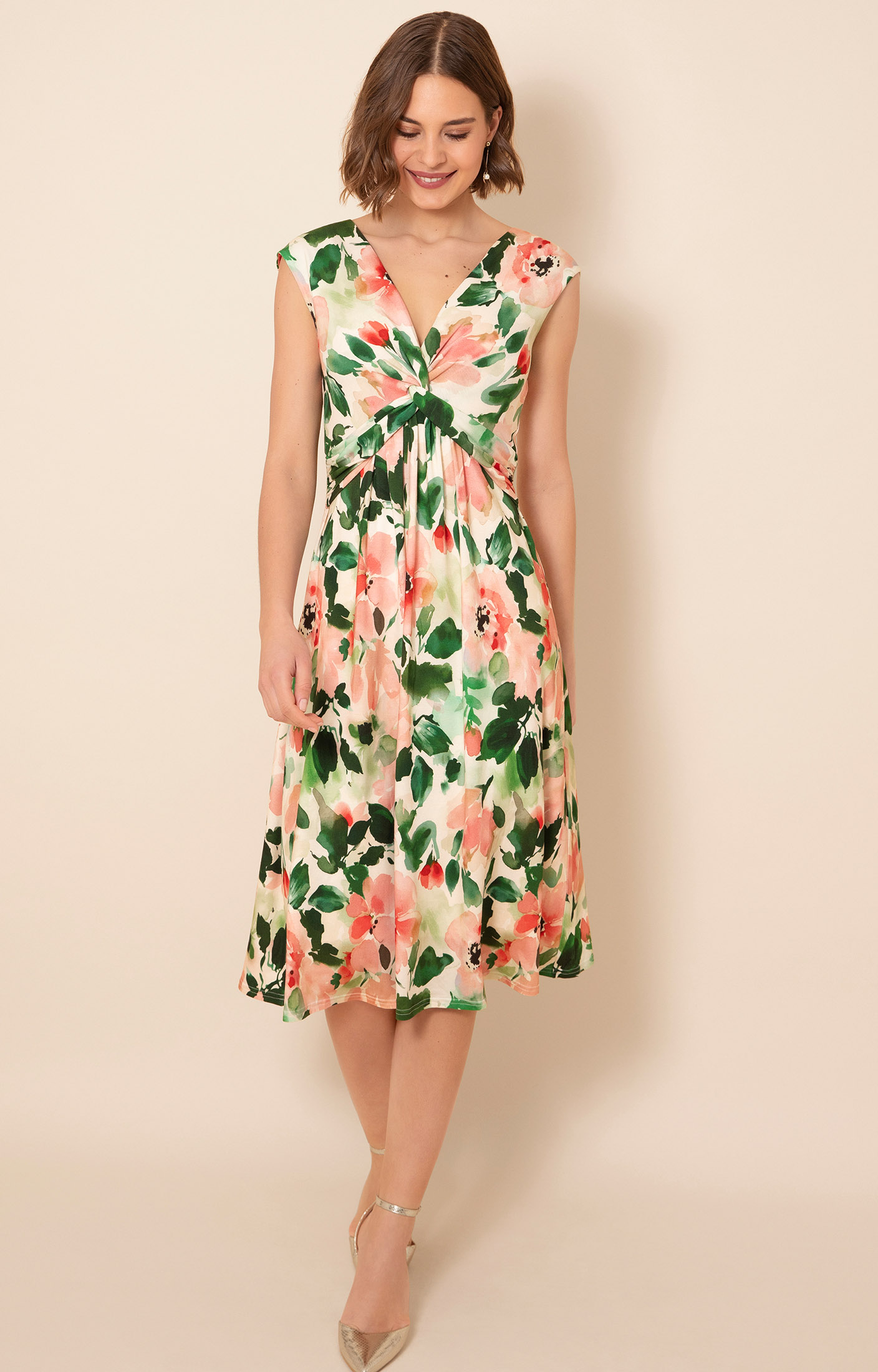 Designed to fit and flatter, the Renee Knot dress is perfect for special occasions. Crafted from a softly draping stretch jersey, our painterly floral print features blush, peach and creamy tones with fresh accents of green.